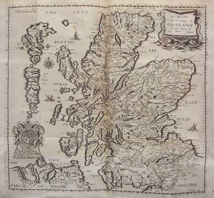 Britannia: or, a geographical description of the Kingdoms of England, Scotland, and Ireland, with the isles and territories thereto belonging ... there is added an Alphabetical table of names and titles, seats of the nobility and gentry that each county of England and Wales is, or lately was, enobled with ... 1st edition, titlepage in red and black, with 49 maps (of 50, lacking that of the Isle of Wight, etc.), and a plan of London, also with 24 plates illustrating 812 coats of arms, contemporary calf, repaired and rebacked, 3 leafs of the illustrations of arms with 2 inch splits at the inner margin affecting the engraved surface of the plates (but with no actual loss), folio, London: Roycroft, 1673