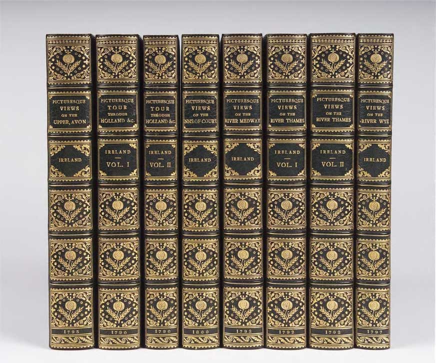 Picturesque views, with an historical account of the Inns of Court, in London and Westminster ... 1st edition, hand col. frontis. and 20 other hand coloured engravings, uniformly bound with the above, a few leaves a little discoloured, 8vo., London: Faulder, 1800