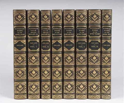 Picturesque views on the River Thames from its source in Glocestershire [sic] to the Nore ... 1st edition, 2 volumes, hand coloured engraved titlepage to each vol., 2 black and white maps, 52 hand coloured plates, full green morocco, gilt panelled, spines decorated gilt in compartments, inner gilt dentelles, t.e.g., by Riviere, repair to paper fault in p. 5 of vol. 1, some very light spotting to margins of some plates, 8vo., London: Egerton, 1792