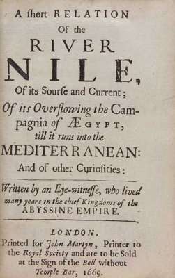 A short relation of the River Nile of its source and current; of its overflowing the campagnia of Ægypt, till it runs into the Mediterranean and of other curiosities ... 1st English edition, pp. [ix], 105, verso blank, contemporary sheep, scuffed, 8vo., London: John Martyn, 1669