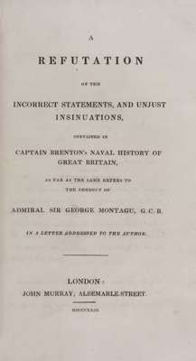 1. Biographical sketch of Henry, Lord Viscount Melville, Edinburgh, 1811. 2. Papers relating to the action between HM sloop Little Belt and the US frigate President, London, 1811. 3. Three letters relating to Lord Lovat, etc. [n.d.]. 4. Lives of various naval officers (unidentified). 5. Report of the Committee of Secrecy. London, 1799. 6. Sturt. The real picture of France in the year 1809. London, 1810? (lacking titlepage). 7. Jennings. Description of Lord Exmouth's attack upon Algiers painted by Henry Aston Barker. London, 1818 with fldg. frontis. 8. James. A reply to "A brief statement ... on the conduct and character of Lord William Fitz-Roy in the year 1805". London, 1824. 9. Statement of a correspondence which has taken place between Admiral Sir George Montagu and Capt. Edward Pelham Brenton. London, 1823. 10. A refutation of the incorrect statements .. contained in Captain Brenton's Naval history of Great Britain ... London, 1823. 11. A letter from the King to his people. 9th edition, London, [ c. 1820]. 12. A second letter from the King to his people. 2nd edition, London, 1821. 13. Letter from the Queen to her people. 2nd edition, London, 1821. 14. Schiller. The robbers. London, 1800. 15. Byron. Mazeppa: a poem. 1st edition, 2nd issue (i.e. with imprint on verso of p. 71), London, 1819