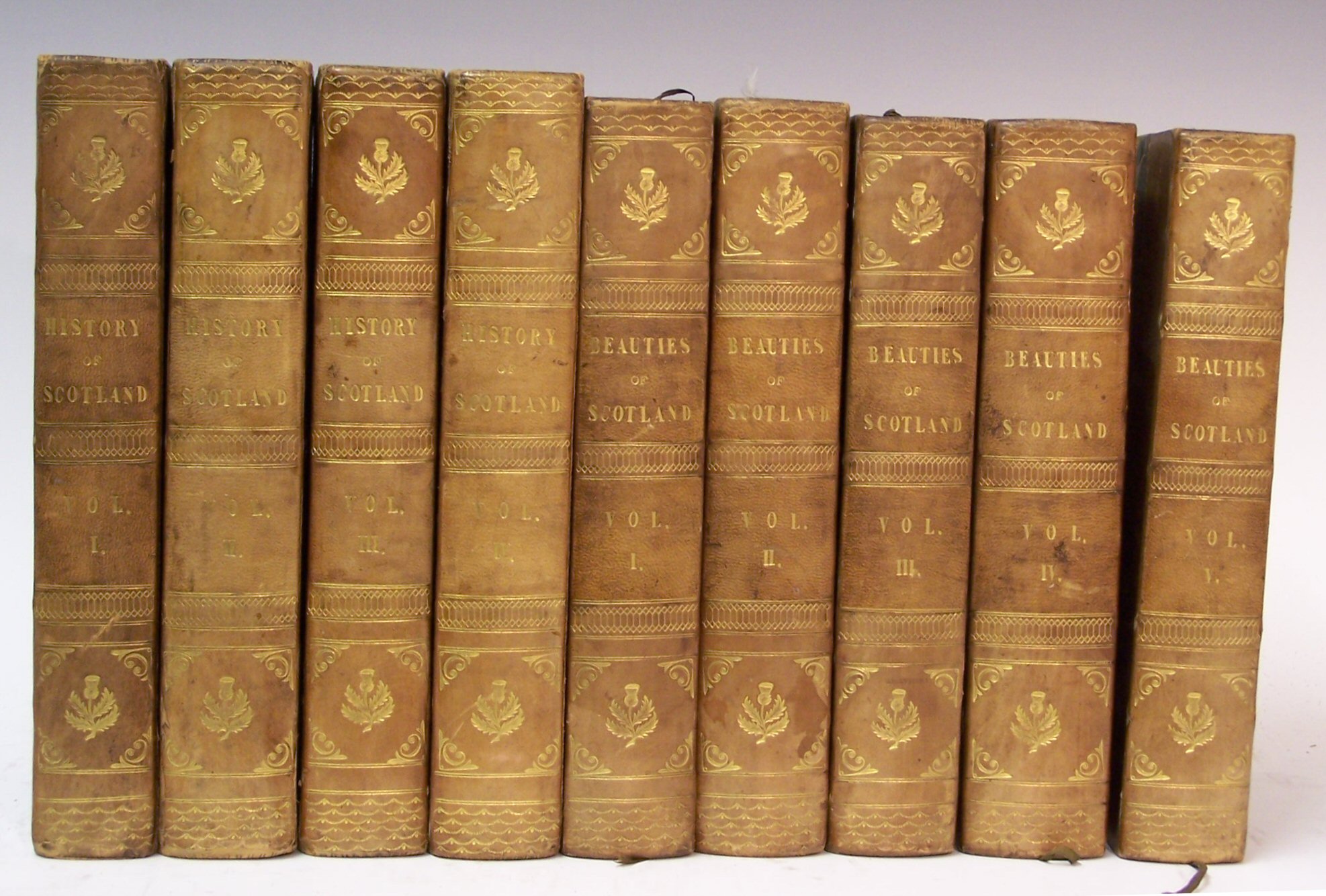 Edinburgh, 1805, 5 volumes, 8vo, engraved titles, 106 [of 108] plates, half calf gilt, rubbed at extremities, varying foxing throughout; Aikan, James The History of Scotland. Glasgow: Blackie, 1827, 4 volumes, 8vo, portrait frontispiece in volumes I - III, folding map volume I, half calf gilt, rubbed, rebacked, foxing, staining (9)
