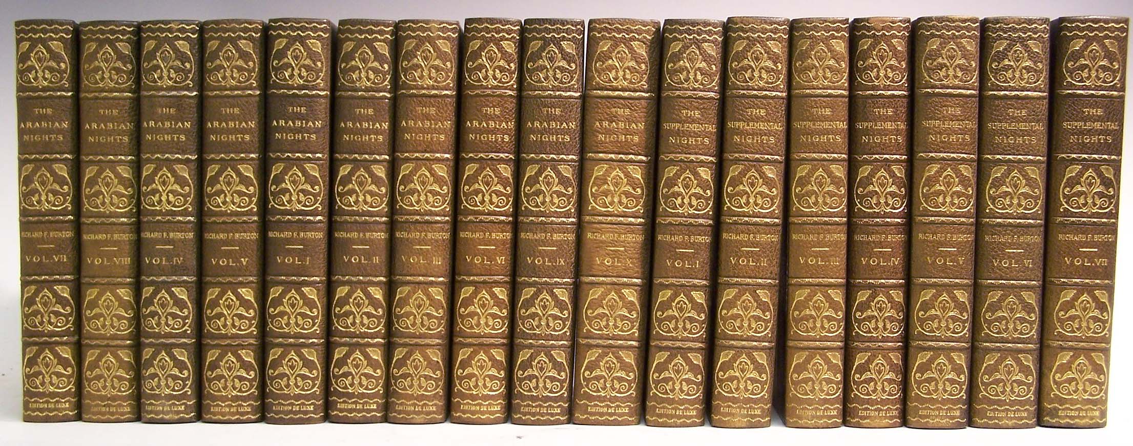 A plain and literal translation of the Arabian Nights entertainments now entitled The Book of the Thousand Nights and a Night. Printed by the Burton Club for private subscribers, [c. 1870's], de luxe edition, number 89 of 250 copies, [10 volumes], 8vo [with] Supplemental Nights to the Book of the Thousand Nights and a Night with Notes Anthropological and Explanatory, [7 volumes], illustrated, half morocco gilt, top edge gilt, marble endpapers, backstrips faded (17)