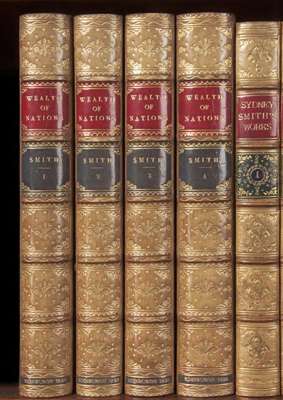 An inquiry into the nature and causes of the wealth of nations: with a life of the author, an introductory discourse, notes, and supplemental dissertations by J.R. McCulloch. Edinburgh: Adam Black, and William Tait, 1828, 4 volumes, 8vo., portrait frontispiece to volume 1, with half-titles, full light tan polished calf, spines decorated gilt in compartments, red and blue morocco lettering pieces, t.e.g., small book-stamp of Patrick Graham at front, light spotting of blanks before half-titles and at end. (4)