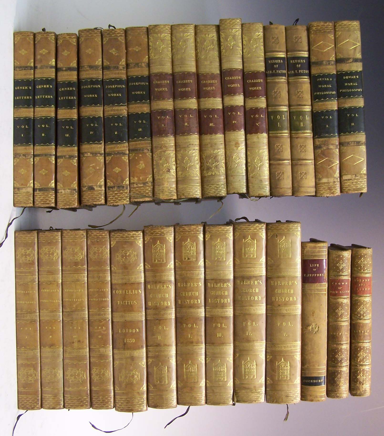 Edinburgh, 1815, fourth edition, 3 volumes, half calf gilt, black labels, rubbed, mild foxing; Crabbe, Rev. George The Works of… London, 1823, five volumes, half calf gilt, red labels, rubbed, occasional foxing; Dewar, Daniel Elements of Moral Philosophy. London, 1826, 2 volumes, half calf gilt, black labels, rubbed, and 18 other similar Nineteenth Century works (28)