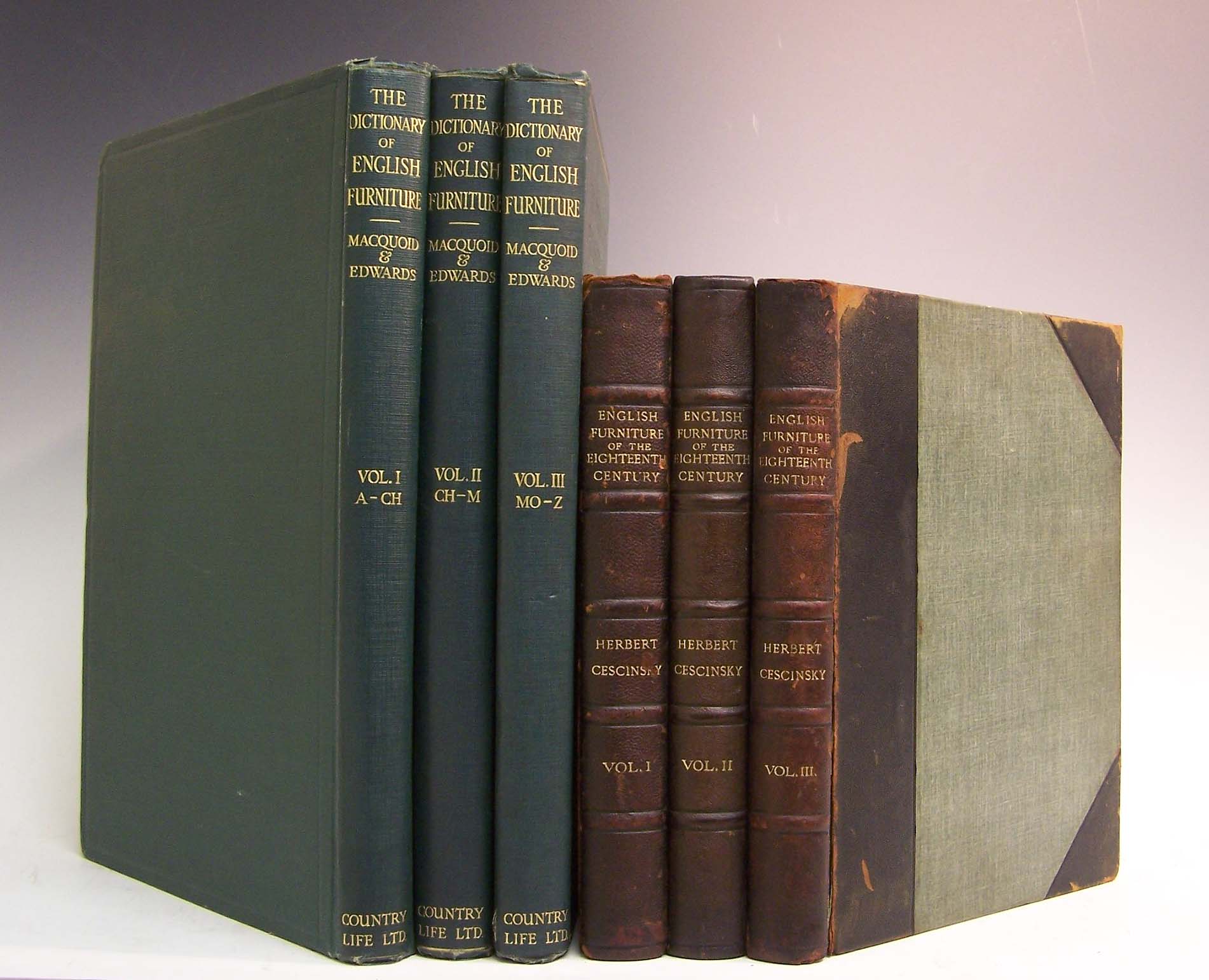 London: Country Life, 1924. First edition, folio, 3 volumes, black and white illustrations and coloured plates, publisher's green cloth, t.e.g, corners bumped, some rubbing to edges; Cescinsky, Herbert English furniture of the eighteenth Century. London: The Waverly Book Company, [c. 1910], 3 volumes, illustrated with black and white photographs, half morocco gilt, rubbed, interior clean (6)