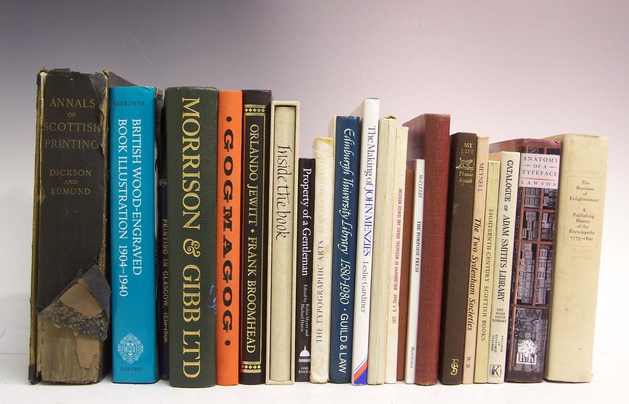 Annals of Scottish Printing. Cambridge, 1890, number 287 of 500 copies, 4to, illustrations, original cloth, very worn; Selborne, Joanna British Wood-Engraved Book Illustration 1904-1940. Oxford 1998, presentation copy inscribed by the author; Chambers, D. & Franklin, C. Morris Cox & The Gogmagog Press. Pinner, 1991, original cloth; Bird, A. Reminiscences of Editors, Reports and Printers during the last sixty years. Glasgow, Printed for Private Circulation, 1890, original cloth-backed boards; Broomhead, F. The Book Illustrations of Orlando Jewitt. Pinner, 1995, original cloth; Esslemont, D. Inside the Book. Solmentes Press, 2002, original cloth, slipcase and 17 others relating to printing (23)