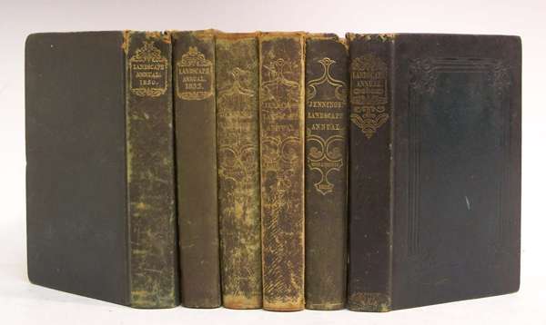 illustrated by S. Prout, 22 engraved plates and a vignette, backstrip and upper board detached; A Tourist in Italy, illustrated by J.D. Harding, 25 plates and vignette; A Tourist in Spain, Andalusia, illustrated by David Roberts, 20 plates and vignette; A Tourist in Spain and Morocco, illustrated by David Roberts, 20 plates and vignette; A Tourist in Portugal, illustrated by James Holland, 17 plates and vignette. London: Robert Jennings, 1830-1839, publishers green morocco gilt, all edge gilt, worn, heavy foxing to titles and frontispieces, marginal foxing to plates (6)