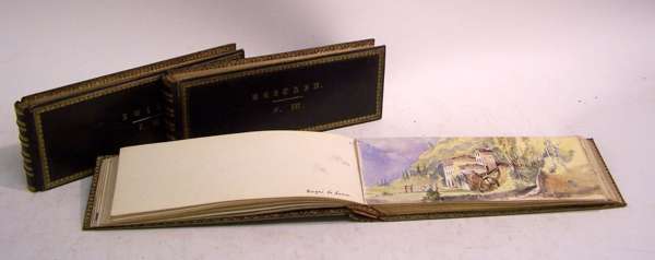 Three sketchbooks of watercolours and pencil sketches showing views of Switzerland, including Zurich and Lucerne; Italy, including Florence, Genoa and the Sierra Nevada mountains; Britain, including Derbyshire and Scotland. Unsigned, circa 19th Century, each sketchbook approx 23cm wide by 9cm high, full blue calf/ morocco gilt, a.e.g., gilt stamp of initial F.M on upper boards, armorial stamp on lower boards of Britain and Swiss volumes (3)