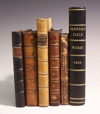 The staggering state of the Scots statesmen. Edinburgh, 1754, 12mo, modern quarter calf gilt, corner of title chipped, some foxing; Crawfurd, David Memoirs of the affairs of Scotland. Edinburgh, 1767. Third edition, 12mo. contemporary calf, hinges splitting, lacking label; Guthrt, Henry Memoirs of... London, 1702, 16mo, half title, modern half calf gilt, ink inscriptions scored through on title; Fletcher, Andrew, of Saltoun The political works of... Glasgow, 1749, 16mo, contemporary calf gilt, some staining along lower edge; Lindsay, Sir David The works of... Edinburgh, 1776, 12mo, later boards, worn, staining throughout; Weber, Henry The battle of Flodden Field. Edinburgh, 1808, 8vo, frontispiece, two folding plates, modern quarter calf gilt (6)