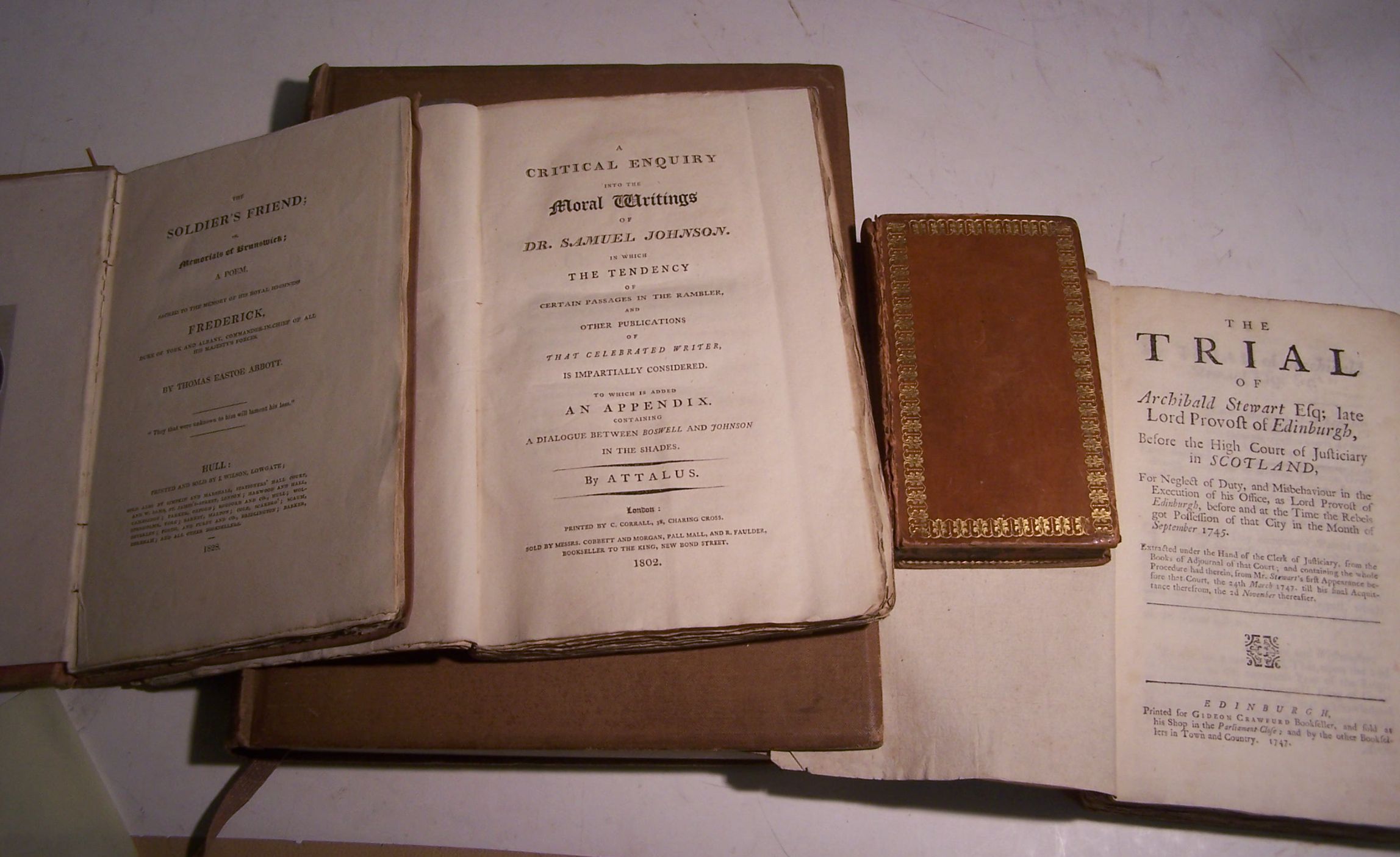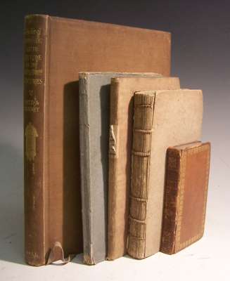 A critical enquiry into the moral writings of Dr. Samuel Johnson... by Attalus. London: Corbett & Morgan, 1802, first edition, 8vo, half-title, original wrappers, uncut; Field, H. & M. Bunney. English domestic architecture, 1928, 4to, original cloth; Abbott, T.E. The soldier's friend. Hull: I. Wilson, 1828, 8vo, engraved frontispiece (loose), original cloth, faded and soiled; [Anon.] The minstrel. Ipswich, 1808, 12mo, engraved frontispiece, contemporary calf, upper joint cracked; Stewart, A. The trial of Archibald Stewart Esq., late Lord Provost of Edinburgh, 1747, 8vo, original boards, lacking paper covers (5)
