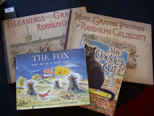 Larder lodge, W. & R. Chambers, [1915], oblong 4to, coloured plates, original boards, a few leaves with short tear, rubbed, spine worn; Upton, B. The adventures of two Dutch dolls, 1923, oblong 4to, cloth-backed boards; Gordon, W.J. Perseus the gorgon slayer, [c.1880], 4to, illustrations by T.R. Spence, original pictorial boards; Doyle, R. The foreign tour of Brown, Jones and Robinson, [n.d.], 4to, illustrations, original blue cloth gilt, slightly soiled; Mauchlineware Scott, W. Marmion, 1866, 8vo, mounted photographs, original pictorial wooden boards, leather spine; Barrie, J.M. Peter Pan and Wendy, Hodder, [n.d.], 4to, 12 coloured plates, original cloth gilt; Uttley, Alison Little grey rabbits birthday, 1961, dust-jacket; Outhwaite, Ida Renoul The little fairy sister, 1923, 4to, 16 plates, original cloth-backed boards, and 13 others (21)