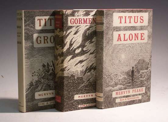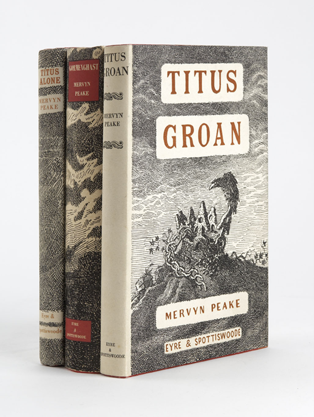 The Gormenghast trilogy. London: Eyre & Spottiswoode, 1946-59. First editions, 8vo, 3 volumes including Titus Groan, Gormenghast, Titus alone, original red cloth, dustwrappers, not price clipped, some slight offsetting to endpapers, otherwise very good (3)