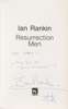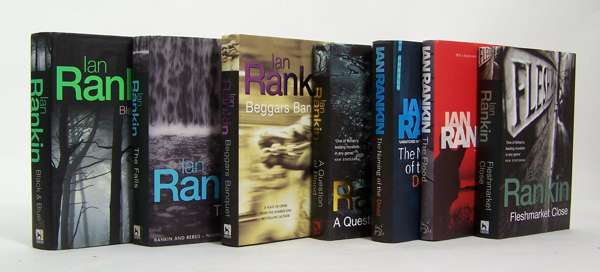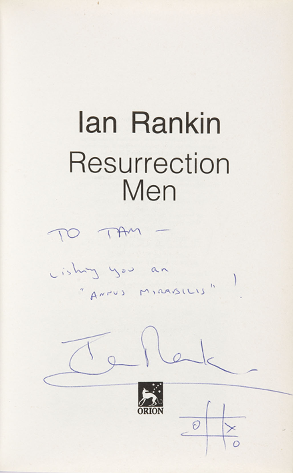 Black & blue. London, 1997, third impression, 8vo, inscribed by the author on the title "In the field of observation, chance favors only the prepared minds... To Tam - Cheers Ian Rankin", original cloth, dustwrapper, some creasing, remainder of tape label to backstrip, front free endpaper pasted to upper board, bookplate in centre of title covering hole in page; Ibid. The falls. London, 2001, 8vo, inscribed by the author "To Tam - Nunc est bibendum! [Now is the time for drinking!] Ian Rankin (Oxford Bar, Feb 2002)", original cloth, dustwrapper, creased at edges, front free endpaper pasted to upper board, bookplate removed from verso of title; Ibid. Resurrection men. London, 2001. First edition, inscribed by the author "To Tam - Wishing you an "Annus Mirabilis" [Extraordinary Year]!" with knots and crosses below, original red cloth, dustwrapper, newspaper clipping pasted onto introductory leaf; Ibid. Beggars banquet. London, 2002. First edition, 8vo, inscribed by the author "To Tam - Good work enroles? everyone and stands the test of time and sun! A' best, Ian Rankin" with hangman sketch below, original black cloth, dustwrapper; Ibid. A question of blood. London, 2003. First edition, 8vo, inscribed by the author "To Tam - Verbum rebus manet in aeternum (It says here!) Cheers Ian Rankin" with smiley face below, original blue cloth, dustwrapper, sellotape at foot of spine, bookplate? removed from front free endpaper; Ibid. Fleshmarket close. London, 2004. First edition, 8vo, inscribed by the author "To Tam - A' the best! Rebus locuta est. Causa finita est! [Rebus has spoken. The cause has finished!] Oxford Bar 2004 Ian Rankin", smiley face below, original cloth, dustwrapper, front free endpaper pasted to upper board; Ibid. The naming of the dead. London, 2006, 8vo, inscribed by the author "To Tam - Fidus achates Ian Rankin", knots and crosses below, original cloth, dustwrapper; Ibid. The flood. London, 2005, 8vo, inscribed the author "To Tam - Fidus achates Ian Rankin", knots and crosses below, original cloth, dustwrapper, front free endpaper pasted to upper board (8)