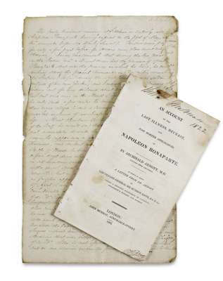 Manuscript report regarding the final days, post mortem and death of Napoleon Bonaparte on St. Helena, dated 6th July 1821, folio, two leaves, approx 32 by 20cm, discussing the key points in the final days of Napoloen's illness, "On the 17th March he became seriously indisposed, and for four or five days some alarm existed, the dragoons were galloping in all directions with messages... Bonaparte had given positive orders to his attendents not to admit anyone sent there by the governor, however the excruciating pain... induced him to yield, but he would never take any medicine that was either prescribed or prepared by the surgeon of the 20th [Dr Arnott] although he took medicine from his own attendent, " the report also discusses the post-mortem examination, "The body opened... I was favoured with a sight of the heart and stomach, the latter the entire seat of the disease, which was a cancer, of a schirrous state of that viscus... It was remarked before his death that for more than nine days he had refused all nourishment, which was supposd to proceed from resignation or obstinacy, but the diseased state of the stomach fully accounts for it," the final section outlines Bonaparte's funeral, "After letting the coffin into the grave three vollies from 11 field pieces were fired, and the flagship fired 25 minute guns... the grave was 10 feet long, 10 deep and 5 wide, the bottom happened to be solid rock, in which a space was cut to receive the coffin, and the sides and ends of the grave were walled in by Portland flags....", some chipping to edges and tears along previous folds, small waterstain near centre of first sheet, small section lacking from top right edge of first sheet [approx 8cm long by 1.5cm at widest], some loss to text but still readable; Arnott, Archibald An account of the last illness, decease and post mortem appearances of Napoleon Bonaparte. London: John Murray, 1822, 8vo, disbound, sone chipping to lower right corner, some staining, contemporary ink inscription on title (2)