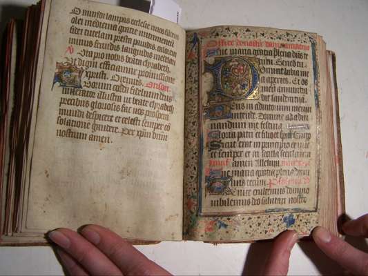 Use of Tournai, late fifteenth century, illuminated manuscript on vellum, one full page miniature (rubbed out with black ink), 109 leaves, 15 x 11cms., initial letters in blue, red and gold, eighteenth century calf, many borders cropped, some light soiling, worn