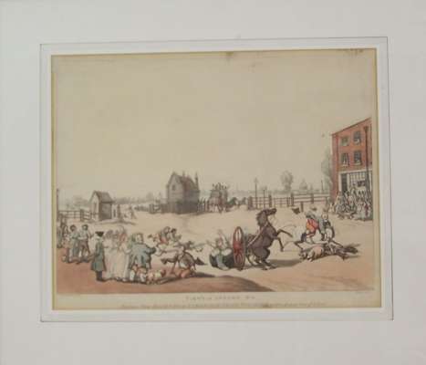 Three aquatints from the Views of London series, to include No.3 Entrance to Tottenham Court Road turnpike; No. 4 Entrance to Oxford Street; No. 6 Entrance from Hackney. London, c.1810, each hand coloured, approx 42 by 34cm high, framed and glazed, faded, one with heavy foxing; and 3 others (6)