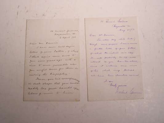 Three autograph letters signed, two to Mrs Rutherford, dated Aug. 14 [?1892], and Aug. 4 [?1890], and one to an unamed recipient, July 8 [?1892] "Dying is generally such a long process that I should prefer it not being delayed"; Spencer, Herbert Two autograph letters addressed to "Mr Darwin" [? Francis Darwin], 6 April 1886, 2 pages, asking for copies of Spencer's letters to Charles Darwin "supposing they have been kept", and one page, 21 May 1883, enclosing a copy [not present] of a letter from Charles Darwin which may be of interest "since it contains some views of his which may perhaps not have been elsewhere expressed"; Autograph postcard to Mrs Rutherford "Would it be troubling you too much to ask you to put aside those books in Mr F. Darwin's study, which belong to the University library (6)