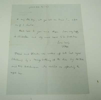 Autograph letter signed to Duncan Grant, stating that he arrived at the Treasury "only to find that both of the engagements for which they recalled me had been put off - they really are devils", and visitors "Jessie and Blanche were waked up late last night (Christmas) by a heavy battering at the door by Mr Jack and Mrs Hutchinson who insisted on spending the night here", two pages, 46 Gordon Square, W.2., 26.12.16