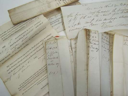 Account current, the Trustees of Messrs. James Ballantyne & Co. and Sir Walter Scott, Bt., with John Gibson for expenses incurred on his journey to Paris collecting material for completing Napoleon, and other expenses, 15 May 1827, account submitted to Trustees of Sir Walter Scott by John Gibson for books purchased, 10 Sept. 1825; list of debts due by the proprietors of the Edinburgh Weekly Journal at 31 March 1826 (totalling £3,748); letter concerning the sale of the additional volume (the 9th) of the Life of Napoleon Bonaparte, 29 May 1827; Copy part of letter Mr Gibson to Mr Rees, concerning sale of first edition of Memoirs of Napoleon Bonaparte, 27 Sept. 1826, a quantity of requests and receipts from creditors for payment of dividends from the estate of Sir Walter Scott, account to James Ballantyne from John Young, bookbinder, for binding of books including 30 copies of Woodstock, 18 July 1827; Account submitted by James Ogilvy for examining the state of affairs of Messrs. Ballantyne & Co., 1 June 1827; Valuation of debts of the Edinburgh Weekly Journal, 27 May 1827, Letter from the publishers Longman Rees &c. to John Gibson regarding the sale of Sir Walter Scott's Poetical works, 27 Nov. 1826; Letter from Robert Cadell to John Gibson regarding the printing of 1100 copies of Tales and Romances, 11 Feb. 1838; Letter from John Hughes to John Gibson informing him of the arrival of the conclusion of the manuscript of Chronicles of the Canongate at the printers, 1 Oct. 1827; and many similar other receipts, invoices & documents (quantity)