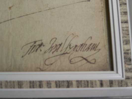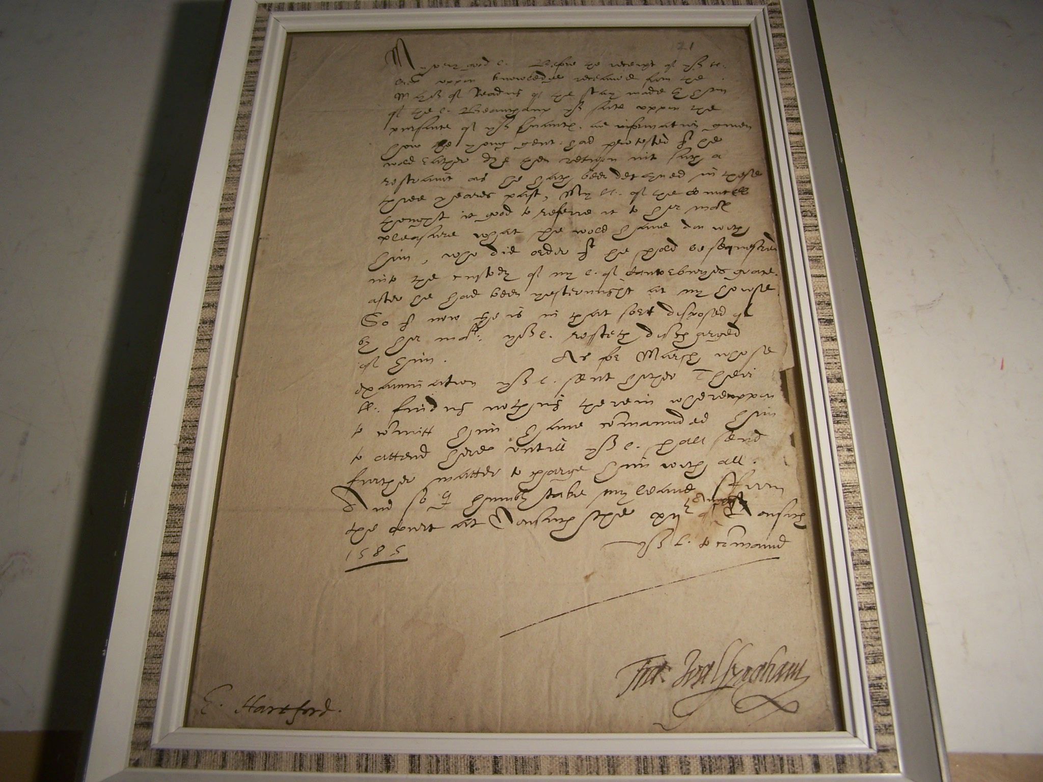 Autograph letter signed from Francis Walsingham, to the Earl of Hertford concerning Lord Beauchamp's escape: My L[ords] of the Councell thought it good to referre it to hir ma[jesty]s pleasure what she wold haue don with him, who did order that he shold be [sequestred] into the custody of my L[ord] of Cantorburyis grace", also referring to an examination of Marsh, one leaf, folio, 31 x 20cm, 12 August 1585, signed Fra[ncis] Walsyegham, framed and glazed
