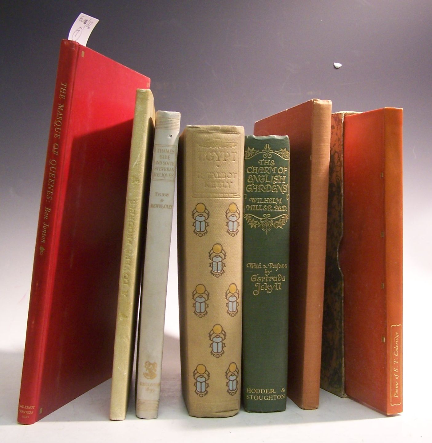 Egypt painted and described, A. & C. Black, 1902, 4to, number 198 of 500 copies signed by the author, original pictorial buckram, lower cover lightly marked; Coleridge, S. Selected poems. Nonesuch Press, 1935, 4to, one of 500 copies, orange vellum, uncut, slipcase, spotting to endpapers; Quennell, Nancy, editor A lovers progress. Golden Cockerel Press, 1938, 4to, one of 215 copies, initials printed in red, quarter pigskin, binding somewhat soiled; Jonson, Ben The masque of queenes, The Kings printers, 1930, 4to, one of 350 copies, original red boards gilt; Wheatley, H.B. Reliques of old London upon the banks of the Thames, 1899, 4to, one of 280 copies signed by Thomas Way, quarter vellum; Miller, W. The charm of English gardens, [n.d.], 4to, original cloth; Rickman, P. British & American game birds,1945, 4to, original cloth (7)