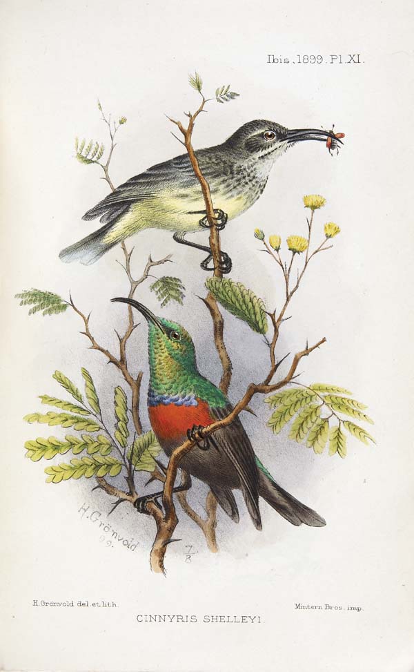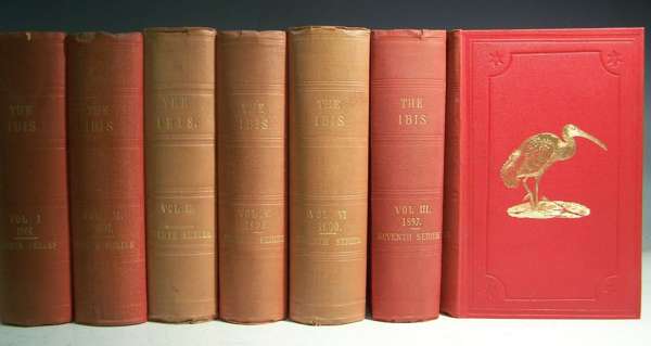 The Ibis, a quarterly magazine of ornithology. London, 1897-1953, 62 volumes, 8vo, colour plates, including 7th series volumes III-VI [1897-1900], 8th series volumes I-VI [1901-1905], 9th series volumes I-VI including 1908 supplement [1907-1912], 10th series volumes I-VI including 1915 supplement [1913-1918], 11th series volumes I-VI [1919-1924], 12th series volumes I-VI including 1927 supplement and 1930 supplement with plate volume [1925-1930], 13th series volumes I-VI [1931-1936], 14th series volumes I-VI [1937-1942], volumes 85-95 [1943-1953], uniform red cloth gilt, with gilt stamp of Ibis on upper boards, backstrips with varying fading, some hinges cracking (62)
