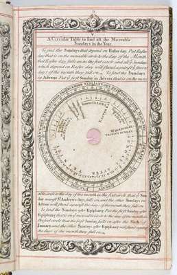 Book of common prayer. London: John Sturt, 1717, 8vo, two portraits, volvelle, final advert leaf, black with red rules, engravings throughout, contemporary black morocco gilt, tooled decoration on both boards, marble endpapers, t.e.g., some fading to backstrip, lacking front blank, interior clean