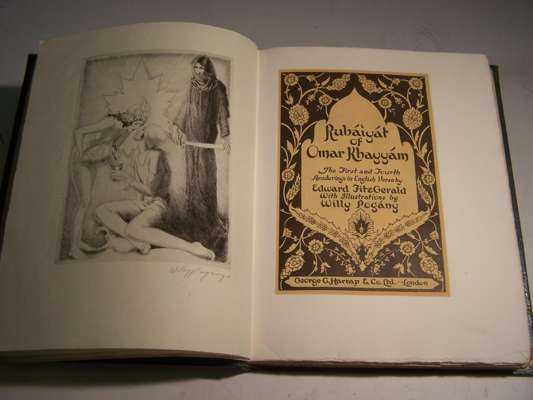 Rubaiyat of Omar Khayyam. London: George Harrap, 1930, 4to, number 488 of 750 copies, signed by the illustrator, additional frontispiece also signed, 12 tipped in colour plates, some pages uncut, original turquoise moroocco gilt, gilt stamp on upper board, some fading to backstrip, interior clean