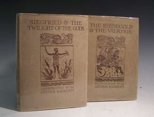 Siegfried & the twilight of the gods,. London, 1911; The rhinegold & the valkyrie. London, 1910, 4to, 30 and 34 coloured mounted plates by Rackham, original buckram gilt, dustwrappers, price excised from spine of first dustwrapper, three Heinemann advertisement slips dated 1911 loosely inserted, a few leaves lightly spotted (2)