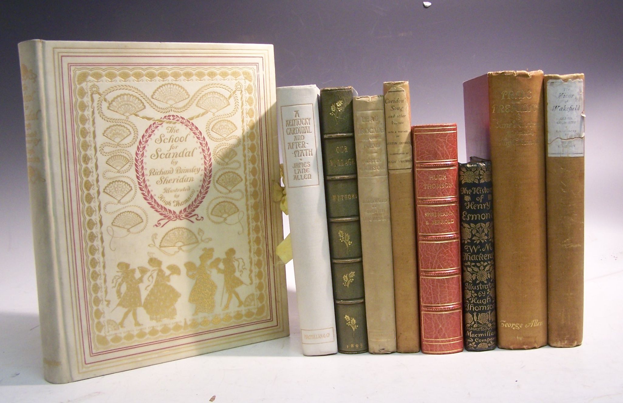 The school for scandal. London, [1911], 4to, number 177 of 350 copies, signed by the artist, 25 tipped in plates, original vellum gilt, silk ties intact, some spotting to endpapers, bookplate; Allen, James Lane A Kentucky cardinal and aftermath. London, 1901, large 8vo, one of 250 large paper copies, illustrated by Thomson, original white cloth gilt, some browning to endpapers; Mitford, Mary Russel Our village. London, 1893, 8vo, one of 470 large paper copies, illustrated by Thomson, later green morocco gilt, backstrip sunned, ink inscripition on endpaper; and 6 others illustrated by Hugh Thomson (9)
