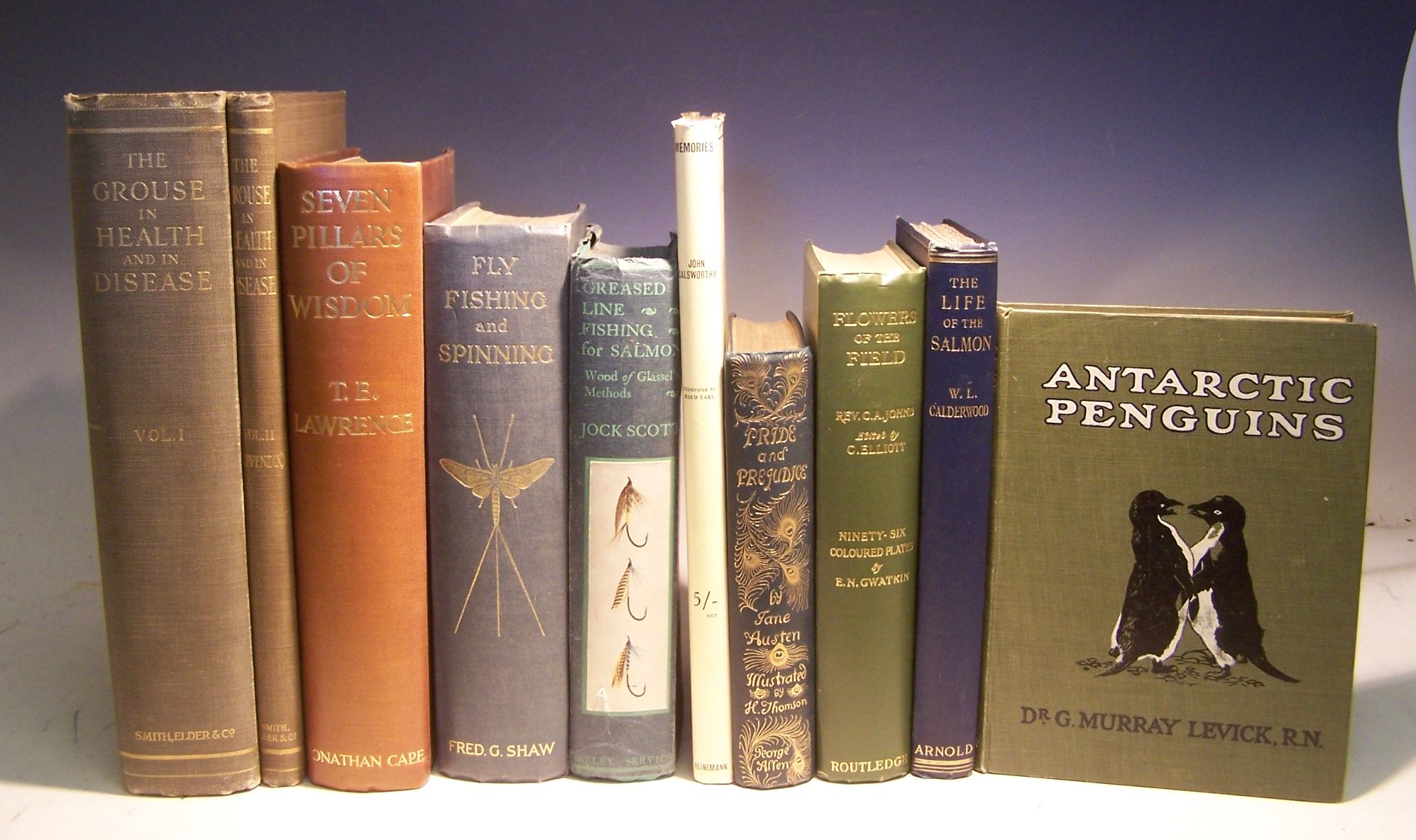 The grouse in health and in disease. London, 1911, 4to, 2 volumes, plates, original cloth; Shaw, F.G. The complete science of fly fishing and spinning, 1914, 8vo, original cloth; Levick, G.M. Antarctic penguins, 1914, 8vo, first edition, plates, original pictorial cloth; and a quantity of miscellaneous books