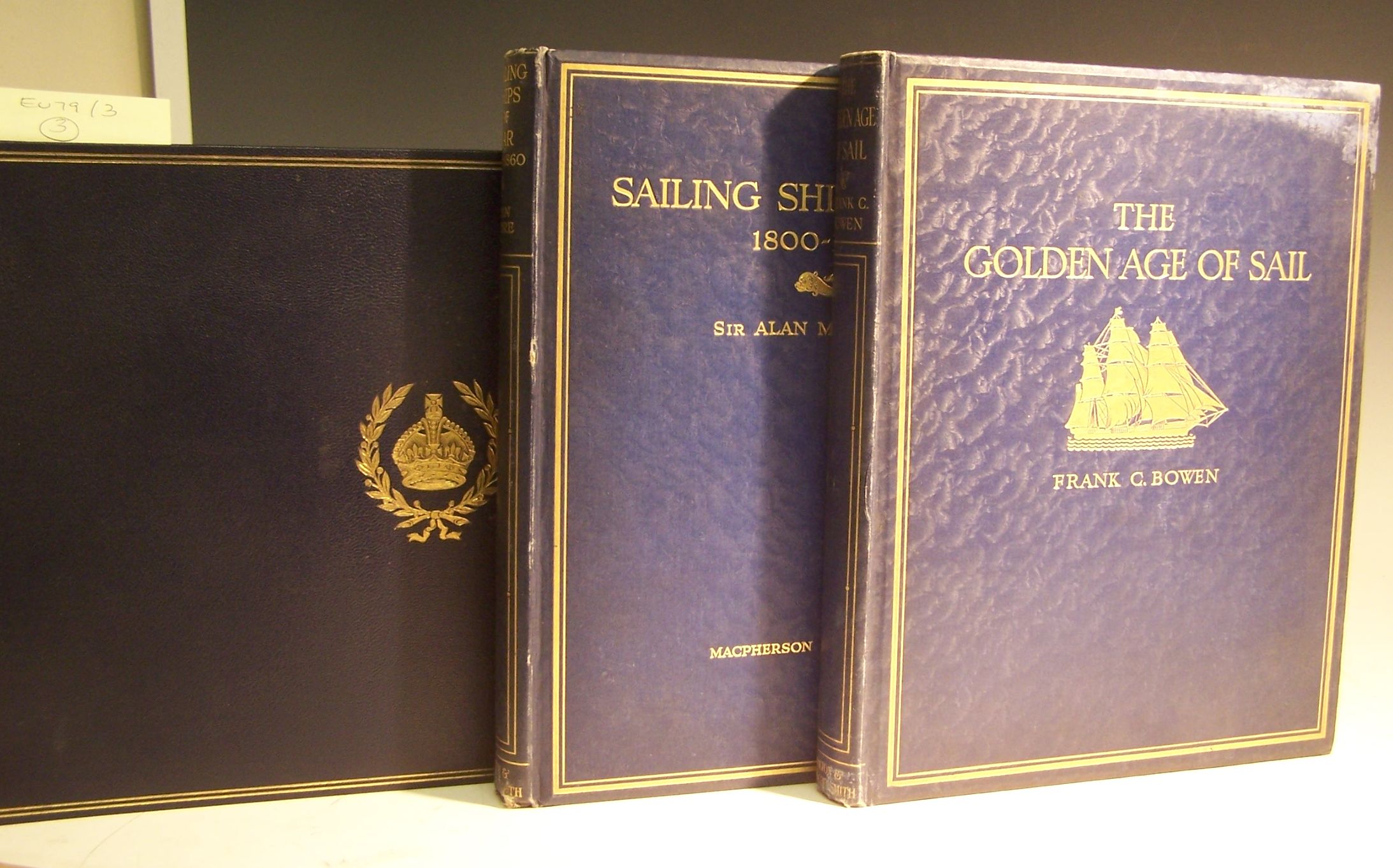 A book of designs of deep sea racing craft. London, 1932, oblong folio, plates, original blue cloth gilt; Moore, Sir Alan Sailing ships of war 1800-1860 including the transition to steam. London, 1926, 4to, number 380 of 500 copies, original cloth gilt; Bowen, F.C. The golden age of sail. Indiamen, packets and clipper ships. London, 1925, number 789 of 1500 copies, original cloth gilt (3)