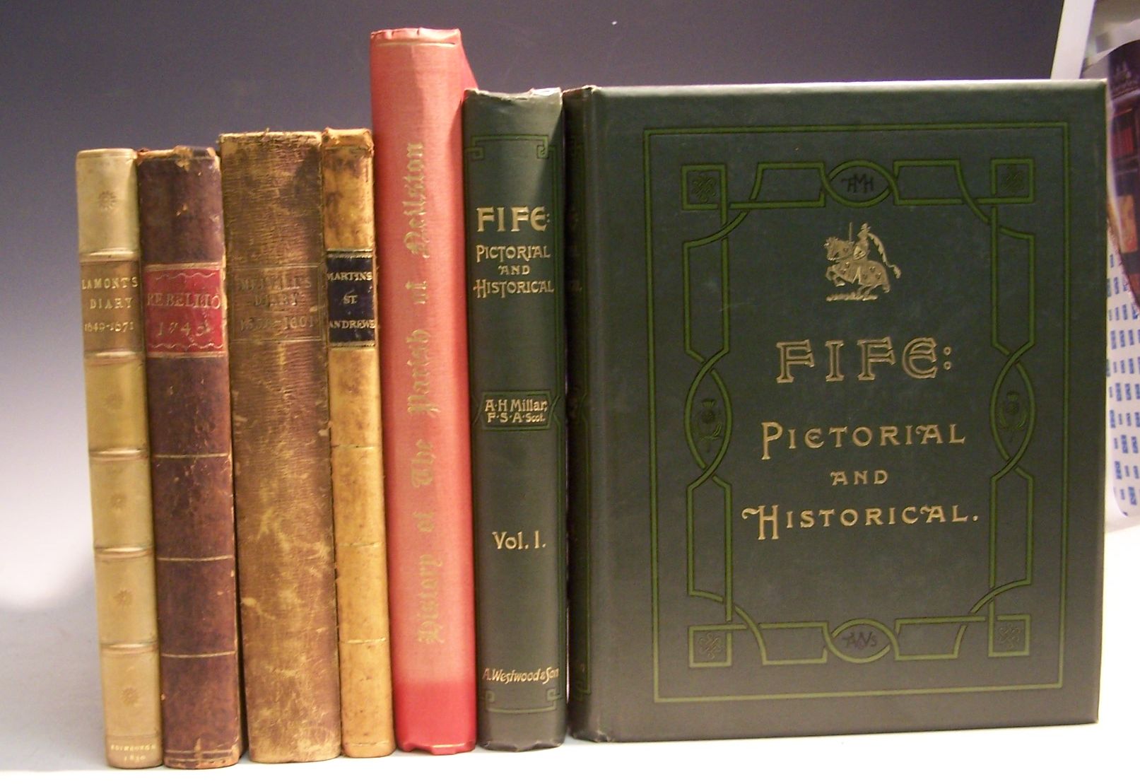 The diary of Mr John Lamont of Newton, 1649-1671. Edinburgh, 1830, 4to, engraved frontispiece, polished calf gilt, t.e.g.; Melvill, James The diary, 1556-1601. Edinburgh, 1829, 4to, engraved frontispiece, contemporary half morocco, short split at head of joints; [Martine, George] Reliquiae divi Andreae, or the state of the venerable and primitial see of St. Andrews. St. Andrews, 1797, 4to, 3 engraved plates, contemporary tree calf, one plate slightly dampstained, rubbed; Home, John The history of the rebellion in the year 1745, London, 1802, 4to, one plate only (of 4), contemporary half calf, rubbed; Pride, David A history of the parish of Neilston, Paisley, 1910, 4to, plates, original red cloth, uncut, spine slightly faded; Millar, A.F. Fife, pictorial and historical. Cupar, 1895, 2 volumes, 4to, original cloth gilt (7)