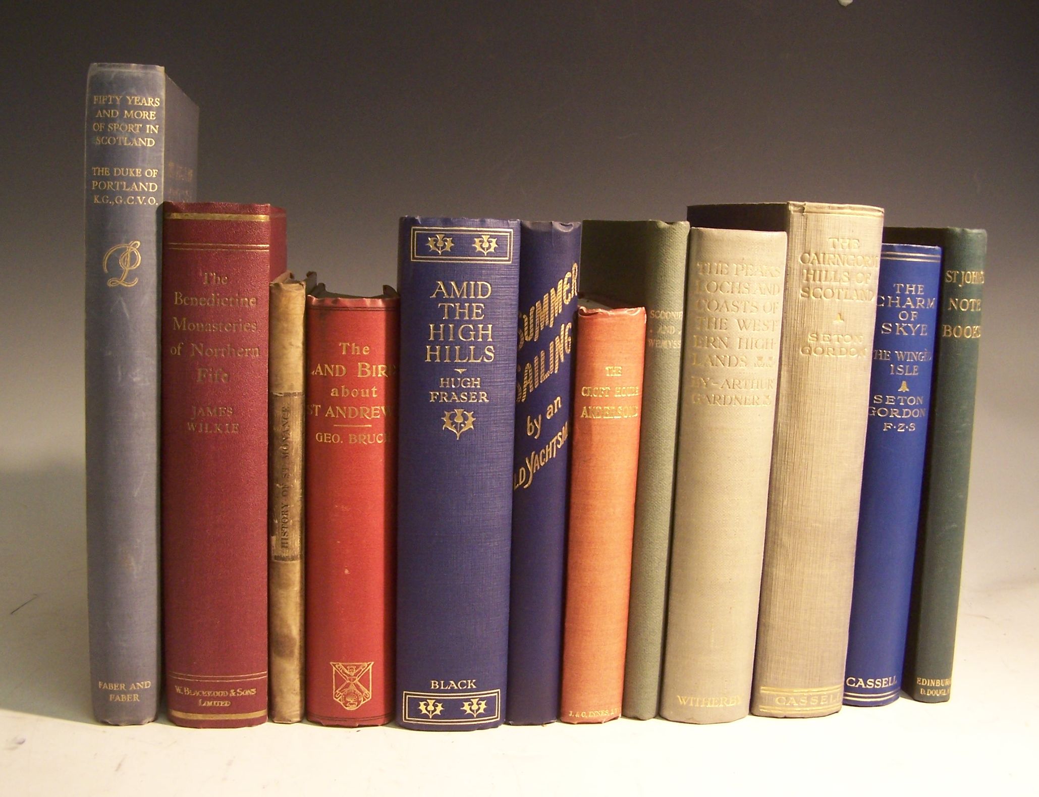 Summer sailings by an old yachtsman, 1898; Wilkie, J. The Benedictine monasteries of Northern Fife, 1927; Jack, John An historical account of St. Monance, Fife-shire, 1844, engraved title; Bruce, G. The land birds in and around St. Andrews, Dundee, 1895; Fraser, H. Amid the high hills, 1923; [Anderson, M.A.] The Croft House Andersons, Cupar, Privately printed, 1933, presentation copy from the author; Cunningham, A.S. Rambles in the parishes of Scoonie and Wemyss, Leven, 1905, presentation copy from the author; Gardner, A. The peaks, lochs & coasts of the western highlands, 1924, spine faded, slight soiling; Gordon, Seton The Cairngorm hills of Scotland, 1925, spine faded; [Ibid.] The charm of Skye, 1931; St John, C. Notebooks 1846-1853, 1901; Portland, Duke of Fifty years and more of sport in Scotland, 1933, all original cloth; and c.80 volumes of Scottish topography (quantity)