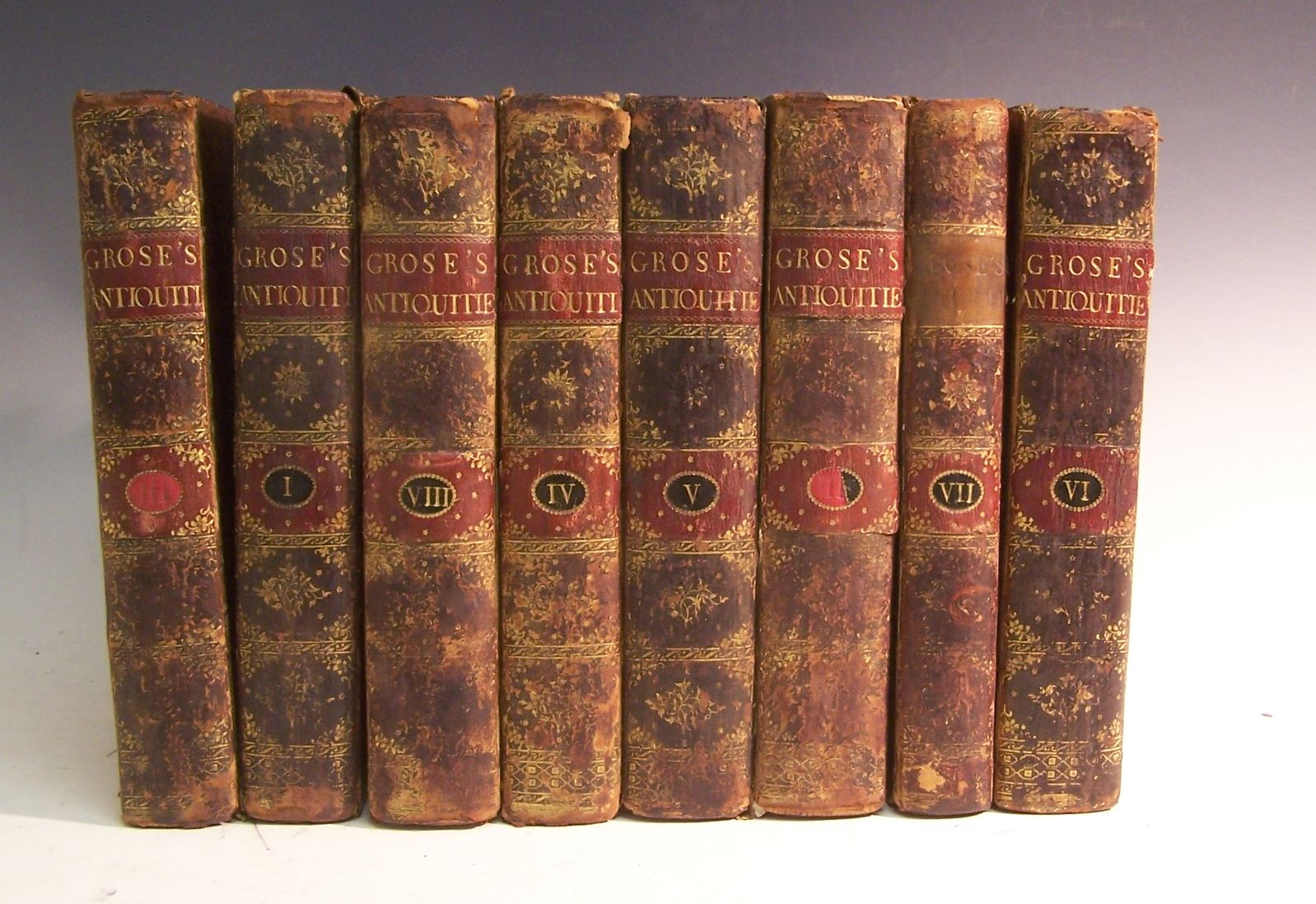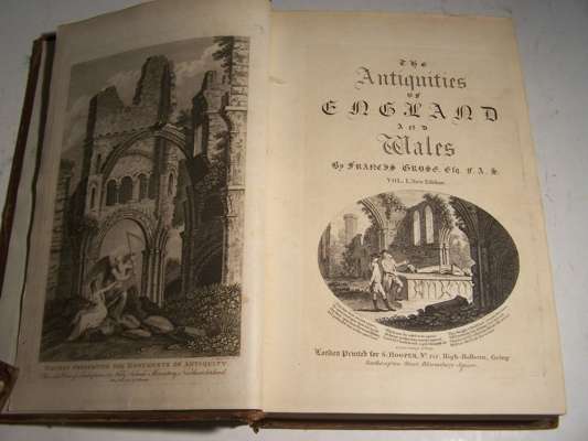 The antiquities of England and Wales. London: S. Hooper, 1783, second edition, 8 volumes including supplement, 4to, engraved titles, numerous engraved plates, hand-coloured engraved maps, contemporary tree calf gilt, red morocco labels, occasional light spotting, spines worn, corners rubbed, joints splitting