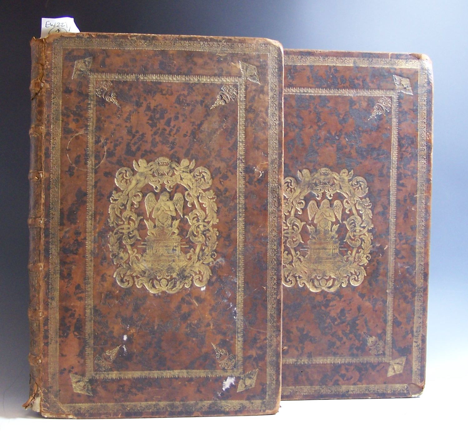 Historie des Ouden en Nieuwen Testaments. Amsterdam: Pieter Mortier, 1700. 2 volumes, large folio, engraved frontispieces, 214 engraved plates, each with 2 views, some by and after Jan Luyken, and 2 [of 5] double-page maps [including the world map], engraved head- and tail-pieces, half-titles, contemporary calf, elaborate gilt device on covers, first volume lacking spine