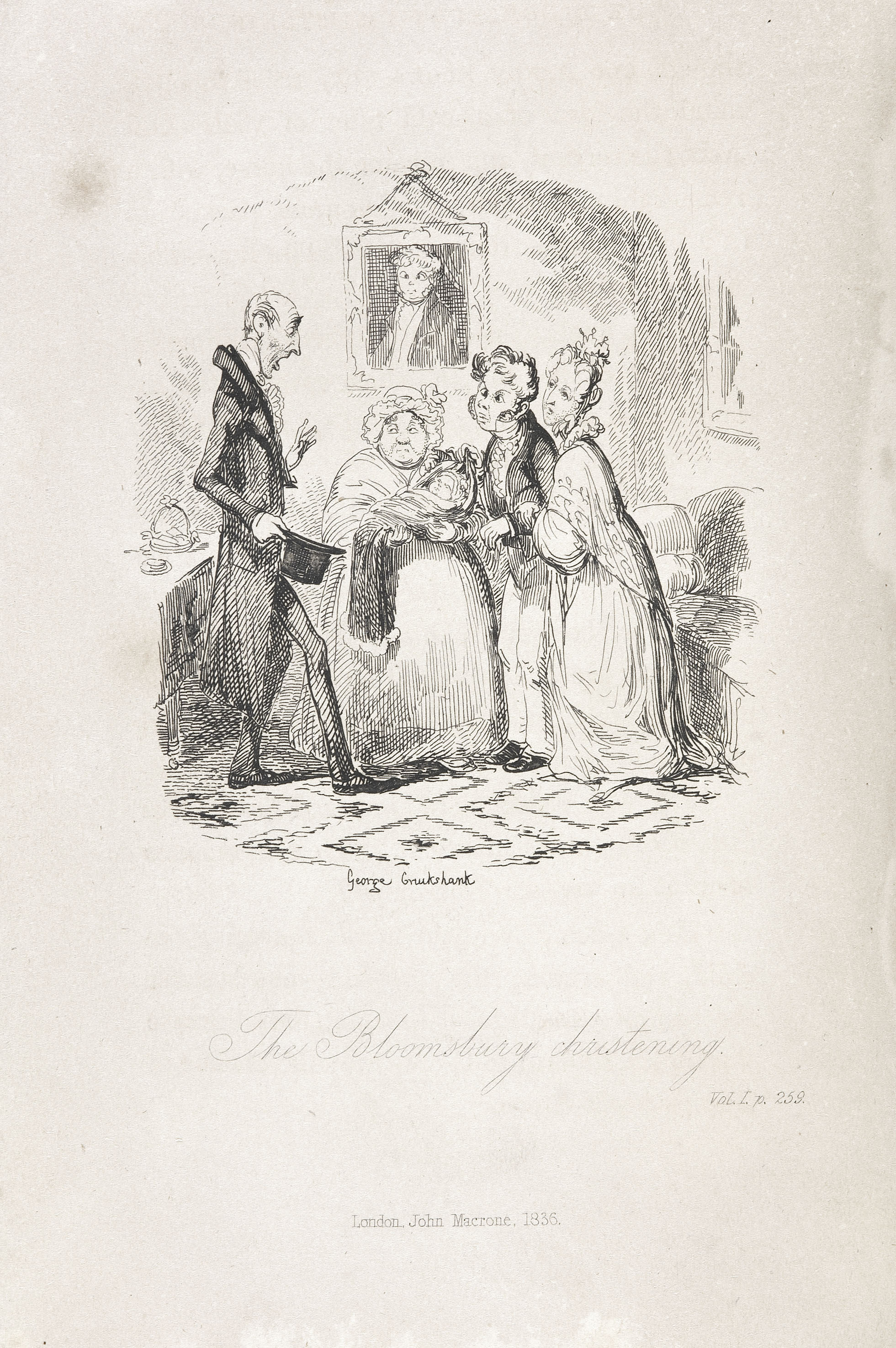 Sketches by "Boz", illustrative of every-day life, and every-day people [First series]. London: John Macrone, 1836. First edition, 8vo, 2 volumes, 16 wood-engraved plates by George Cruikshank, pale yellow coated endpapers, original olive-green embossed leaf-pattern cloth, spines with decorative shield and lettering in gilt, slipcase, lacking protective tissue volume I, plates discoloured, some occasional spotting, recased and rebacked, preserving entire original backstrip volume I and upper two-thirds only volume II (2)