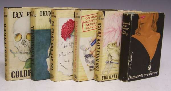 Goldfinger. London, 1959. Second impression, 8vo, original black cloth gilt, dustwrapper, previous owner's ink inscription; [Ibid.] Thunderball. London, 1961. First edition, 8vo, original black cloth gilt, dustwrapper, not price clipped, some chipping to head of backstrip, previous owner's ink inscription; [Ibid.] The spy who loved me. London, 1962. Second impression, 8vo, original black cloth, dustwrapper, not price clipped, previous owner's ink inscription; [Ibid.] On her majesty's secret service. London, 1963. First edition, 8vo, original black cloth, dustwrapper, not price clipped, previous owner's ink inscription; [Ibid.] You only live twice. London, 1964. First edition, 8vo, original black cloth gilt, dustwrapper, not price clipped, 1.5cm tear to upper hinge; and a Book Club edition of Diamonds are forever (6)