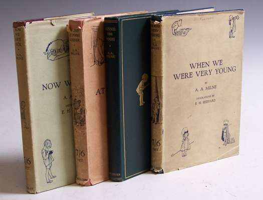 Now we are six. London, 1927. First edition, 8vo, dustwrapper, original red cloth gilt, wrapper chipped at edges, spine faded, pencil mark to rear, head of red cloth spine faded; [Ibid.] The house at Pooh corner. London, 1928. First edition, 8vo, dustwrapper, original pink cloth gilt, wrapper chipped at edges with some text loss to title on spine, head of cloth spine faded, some browning to endpapers; [Ibid.] When we were very young. London, 1924. Fourth edition, 8vo, dustwrapper, original blue cloth gilt, wrapper chipped at edges, some text loss to title on spine; [Ibid.] Winnie the Pooh. London, 1926. Second edition, 8vo, original green cloth gilt, lacking dustwrapper, previous ink inscription on half title (4)