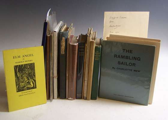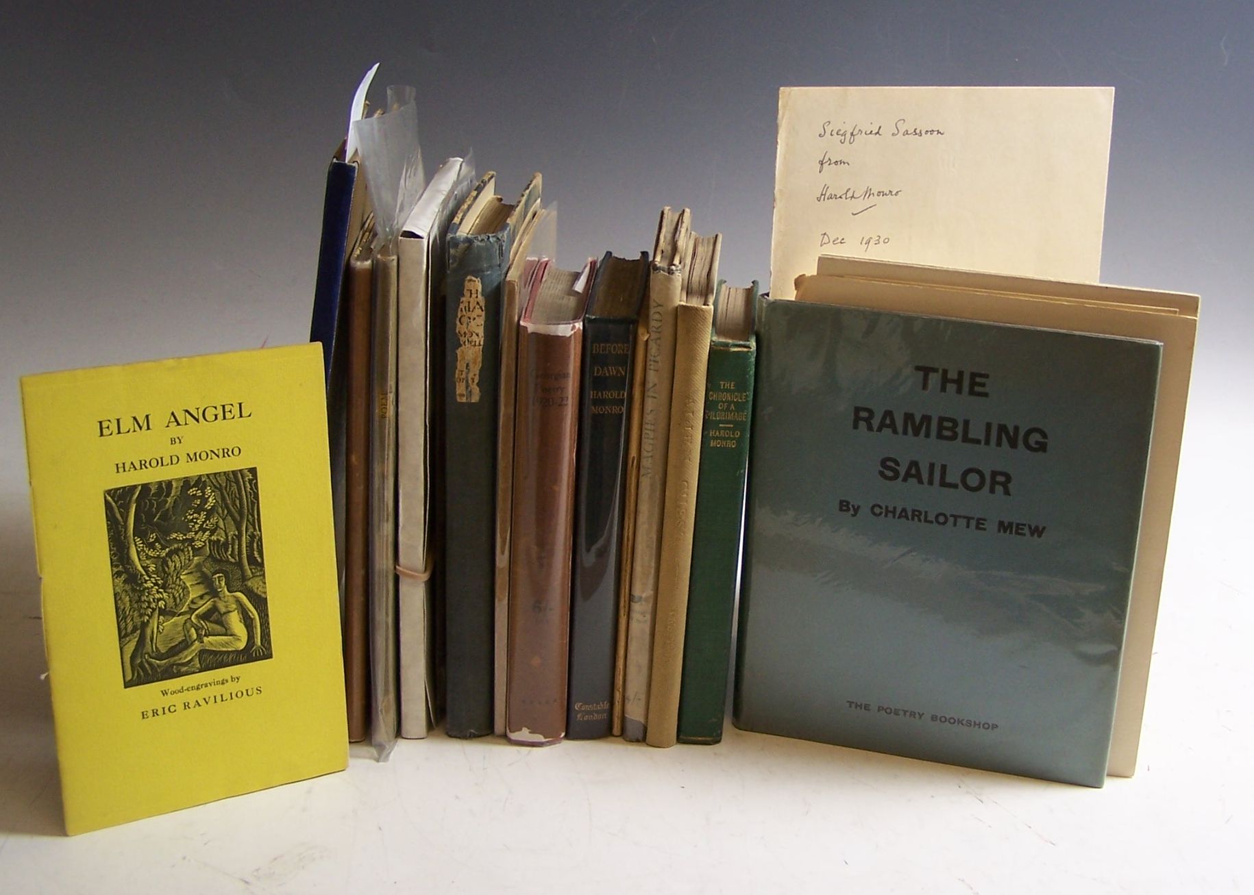 19 works by Harold Monro or published by his Poetry Bookshop, comprising: M[arsh]., E[dward]. Georgian Poetry 1920-1922, 1922; Aldington, Richard. Images (1910-1915), 1915, wrappers; Cotton, Charles. Poems...Decorated by Claud Lovat Fraser, 1922, in red dust-jacket; another copy, in green dust-jacket; Mew, Charlotte. The Rambling Sailor. 1929; Monro, Harold. Children of Love. 1914, presentation copy inscribed by the author to M.T.H. Sadler, wrappers; Strange Meetings. 1917, with a typed letter signed by Monro to the bookseller Mr Firuski tipped in; another copy, second printing, wrappers; Sturge Moore, T. Pan's Prophecy. 1931, wrappers, covers almost detached; Monro, Harold. Before Dawn (Poems and Impressions). Constable & Co., 1911, original cloth, stamped presentation copy, covers marked, lacking jacket; a printed card ("Number Four of a series of four Christmas Cards by modern artists") inscribed by Monro to Siegfried Sassoon in December 1930; three prospectuses; and 5 other volumes; except where stated, all The Poetry Bookshop, 8vo, first editions, original boards and dust-jacket, some spotting or browning, most jackets frayed, brittle or with tears (19)
