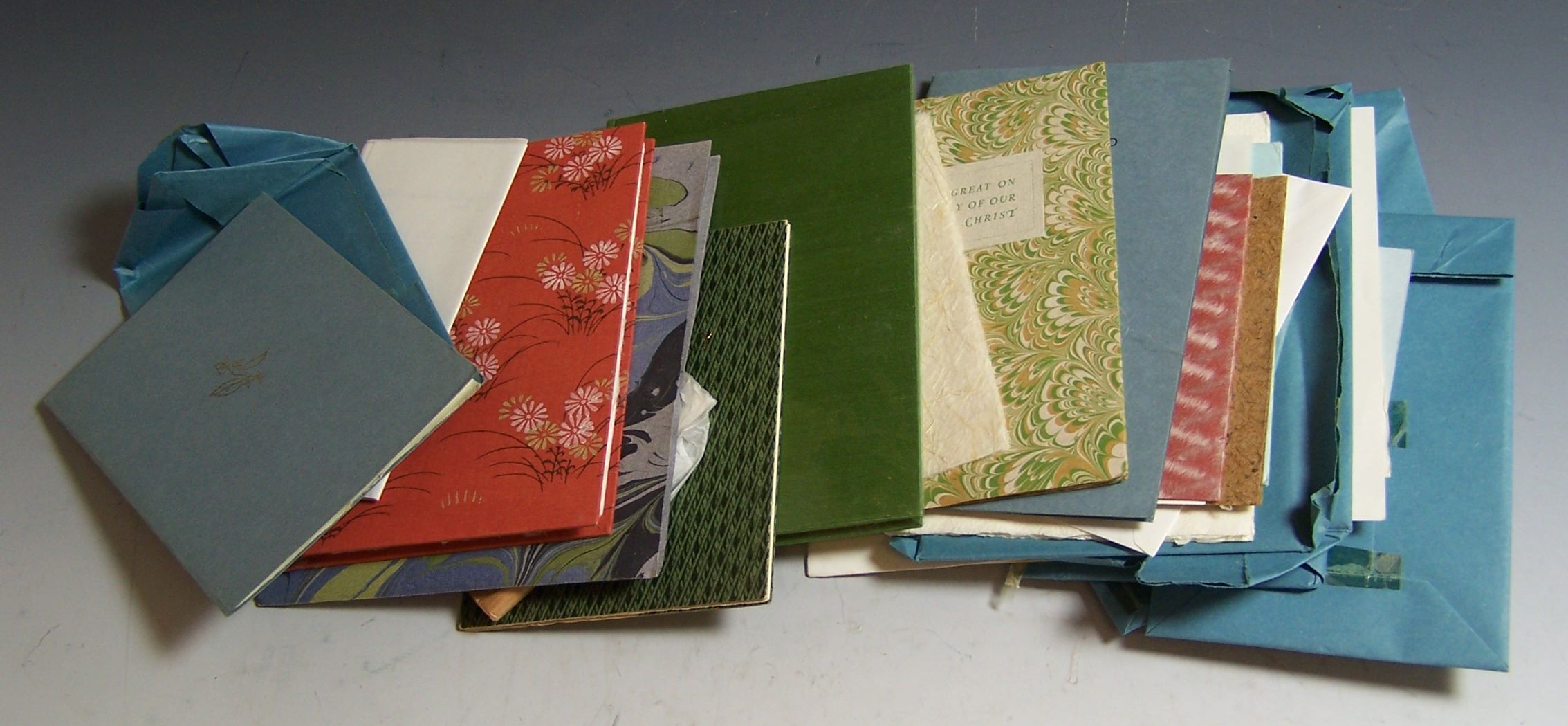 Youth and age. 1983. Limited to 100 copies on Medway handmade paper, hand initial by M. Adams, wrappers; Elizabeth II, Queen The addresses of Her Majesty. Worcester, 1977. 24mo, limited to 1000 copies, blue morocco gilt; Speedwell. Six poems by the Benedictines of Stanbrook. Worcester, 1966. 8vo, original wrappers; Wright, R. Man of God. Worcester, 1969. 8vo, original wrappers; Leo the Great, Saint On the birthday of our Lord Jesus Christ. Worcester, 1958. 8vo, original marbled wrappers; Masefield, J. Mary's spinning. Worcester, 1970. 12mo, limited to 180 copies on Kozu-shi handmade paper with Ogura covers; Robertson, Alec In the little things. Worcester, 1969. 8vo, limited to 260 copies, number 26 of 234 bound in Japanese Shiki silk; Guigo. The solitary life. Worcester, 1963. 12mo, paper wrappers; Stacpoole, A.J. Towards the twilight of life. Worcester, 1970. Oblong 8vo, limited to 120 copies, marbled wrappers; Samaan-Hanna, A. Moods that endure. Worcester, 1978. 8vo, limited to 140 copies on Kakumidate paper, Japanese paper patterned boards, uncut; and 16 other pamphlets, prospectuses or other ephemera from the Stanbook Abbey Press (26)