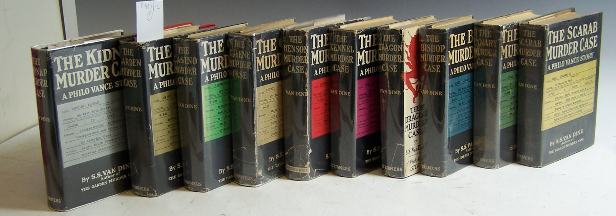 The garden murder case. 1935; [Ibid] The kidnap murder case. 1936; [Ibid.] The casino murder case. 1934; [Ibid] The Greene murder case. 1928; [Ibid.]The bishop murder case. 1929; [Ibid.] The benson murder case. 1926; [Ibid] The canary murder case. 1927; [Ibid.]The scarab murder case. 1930; [Ibid.]The dragon murder case. 1933; [Ibid.] The kennel murder case. 1933; these all New York: Scribner's, first editions, original cloth bindings, dust-jackets, jackets occasionally slightly torn or creased; together with the first English edition of The benson murder case; 8vo (11)