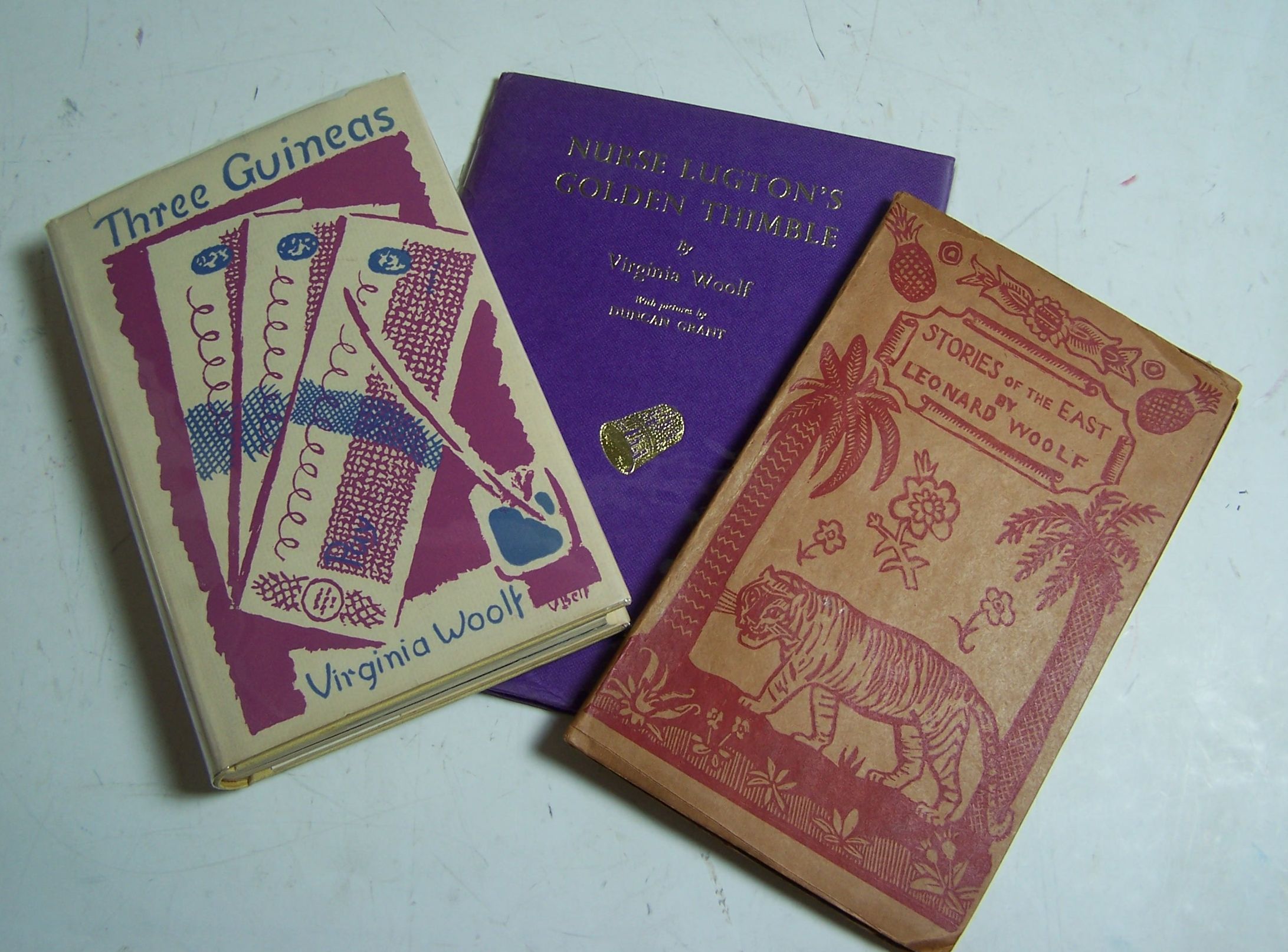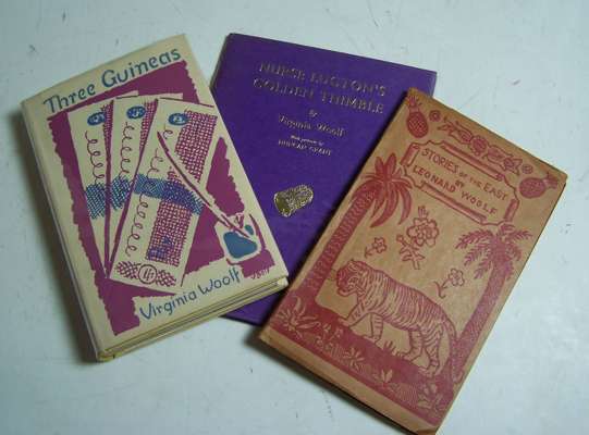 Three guineas. London: The Hogarth Press, 1938. First edition, 8vo, original lemon-yellow cloth lettered in gilt on spine, pictorial dust-jacket designed by Vanessa Bell, [Kirkpatrick A23(a)], some browning to endpapers, slight browning to dust-jacket with occasional short tears; Woolf, Leonard Stories of the east. London: Leonard and Virginia Woolf at The Hogarth Press, 1921. First edition, 8vo, original buff paper wrappers printed in red, [Woolmer 16], removed bookplate, slight creases to wrappers; Woolf, Virginia Nurse Lugton’s golden thimble. London: The Hogarth Press, 1966. First separate edition, illustrations by Duncan Grant, original boards lettered in gilt, [Kirkpatrick A38] (3)