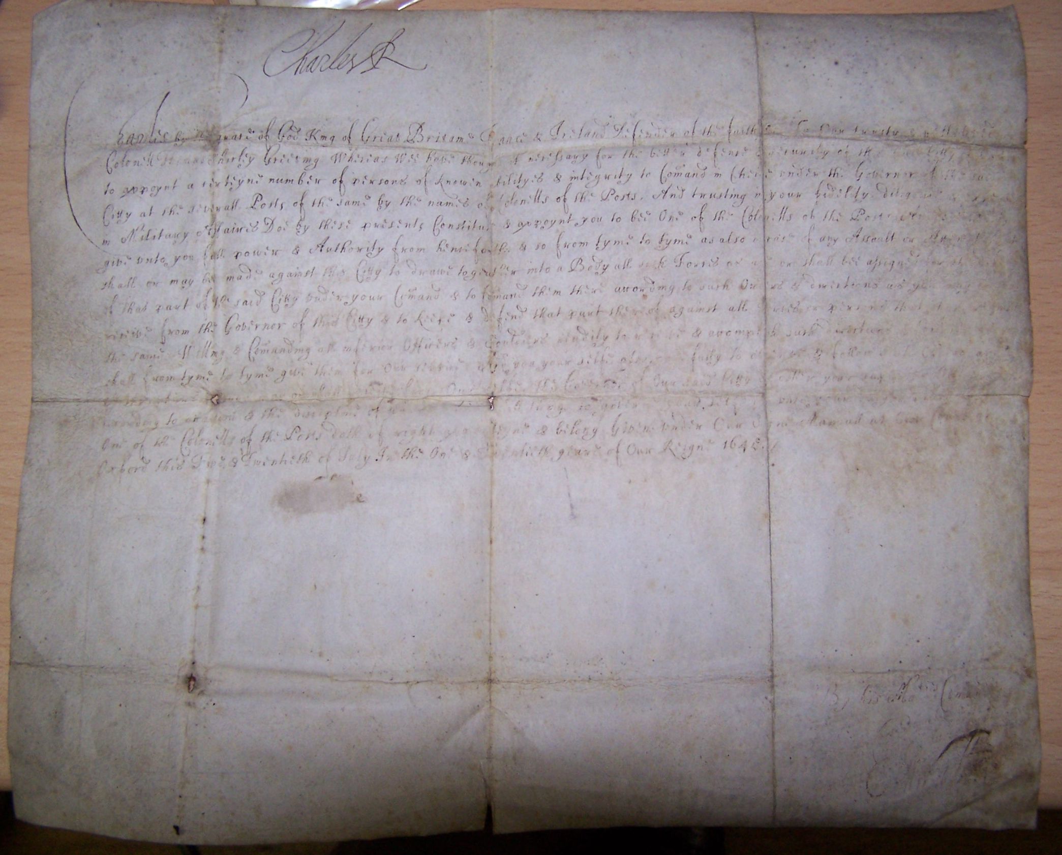 Appointment of Thomas Shirley to position of Colonel of the Posts, 25th July 1645, on vellum, 270 x 310mm., writing worn with appoximately one half illegible, signature clear, folded and slightly soiled; Wellington, 2nd Duke of A.L.S. to Messrs. Hobbs & Hart, complaining of an insolent employee, 8th Dec., 1872, waterstained; Almanach fur 1750. Stockholm: L.L. Greting. 12mo, disbound, with initials on title and a few marginal notes by Emanuel Swedenborg, somewhat dust-soiled (3)