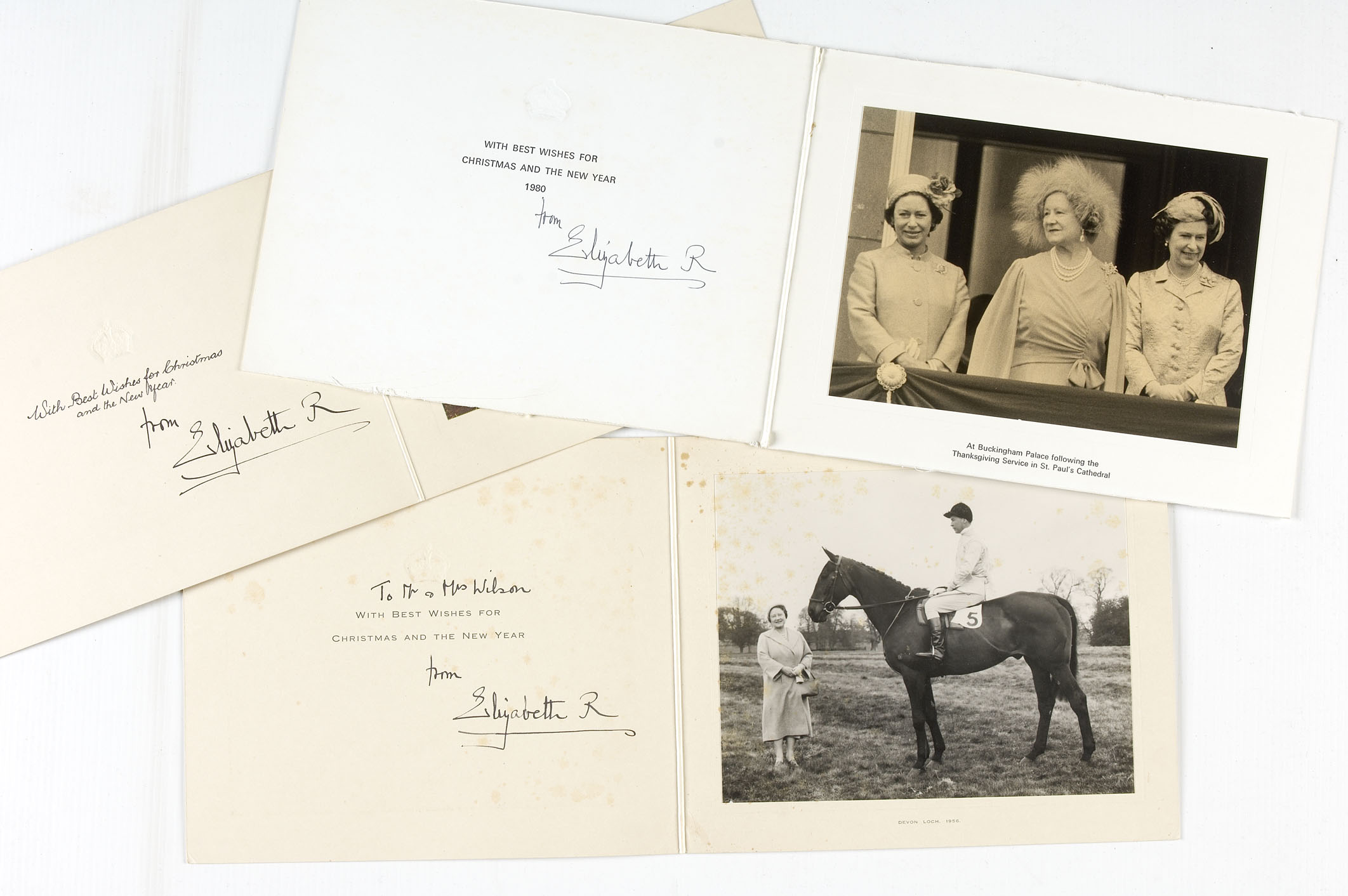 19 Christmas cards signed, for 1956, 1962 and another undated c.1960's, 1980, 1982-83, 1987-1988, 1990-1999, corner of 1961 card slightly bent, 1956 card additionally inscribed "To Mr & Mrs Wilson", 1982 card with additional caption in ink "The birthday present!" (19)
