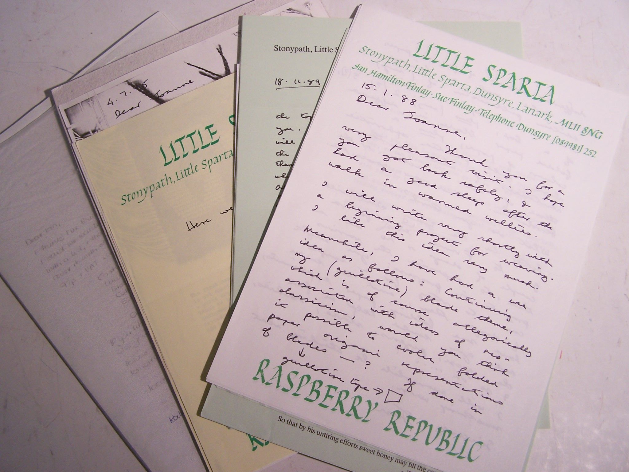 17 typescript and 9 autograph letters from Ian Hamilton Finlay to Joanne Soroka discussing tapestries commissioned from Ivory Tapestries by Finlay between 1988 and 1997 and 26 carbon copies of letters from Soroka to Finlay, and 3 diagrams and a slide. The tapestries were all based on Finlay's concrete poetry and mainly consisted of one-word-per-line short poems: Star/Steer, Wave, Wave/rock. Tye/cringle & Green waters