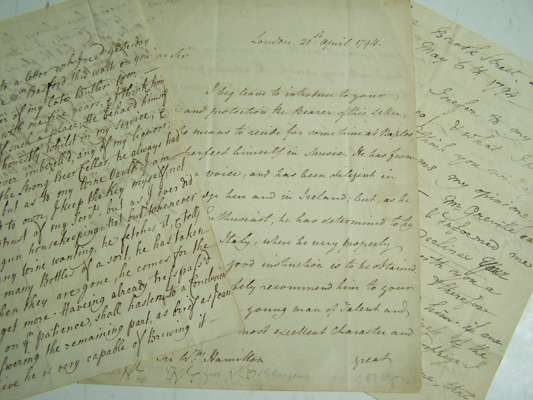 Two letters addressed to Sir William Hamilton: one by Sir James Bland Burges, Under-Secretary for Foreign Affairs, a letter of introduction to the fine vocalist Mr Small ("a young man of Talent and Genius") who wishes "to perfect himself in music" at Naples, also recommending him to Lady Hamilton "whose Patronage will undoubtedly be of the greatest service to him"; the other by the painter and picture-dealer Benjamin Van der Gucht (d.1794), referring to Mr Greville and explaining that Lord Abercorn declines Hamilton's picture, but expressing the hope that the business of an exchange may still be completed, 4 pages, 4to, one integral address leaf with impression of armorial seal in red wax, London, 21 April to 6 May 1794, seal tear, traces of mounting, slight spotting or soiling Included in the lot is a letter by one K. Kneller, to Sir William Halton, recommending a butler who knew how to look after his wine cellar, 2 pages, address leaf, Dunhead Hall, 4 November 1740.