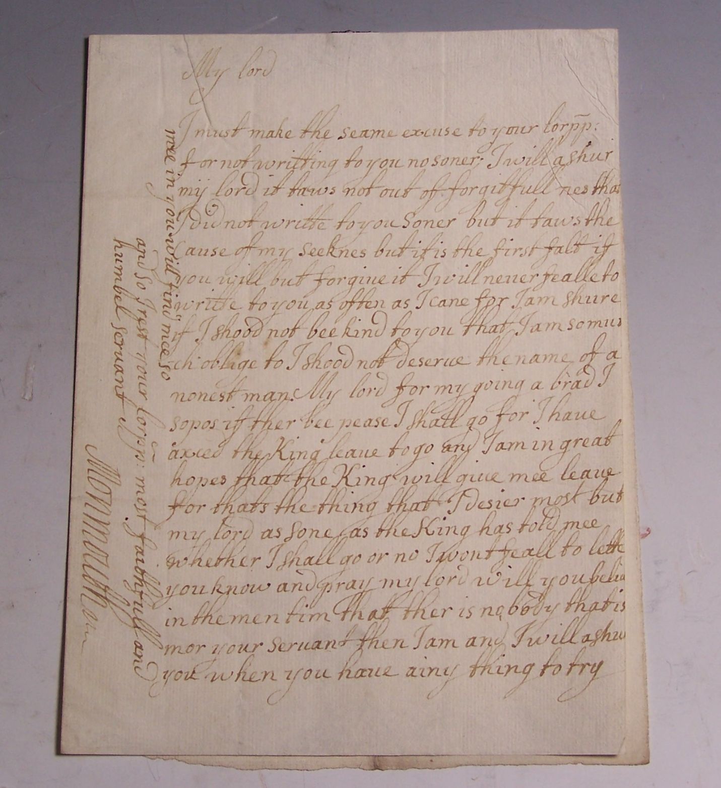 Early letter signed ("Monmouth"), 1 page, small 4to, no place or date, to Lord Cochrane, informing him that he has asked the King if he might go abroad and making an elaborate apology for failing to write sooner, integral address leaf, seal; with a copy of a declaration by Charles II (2)