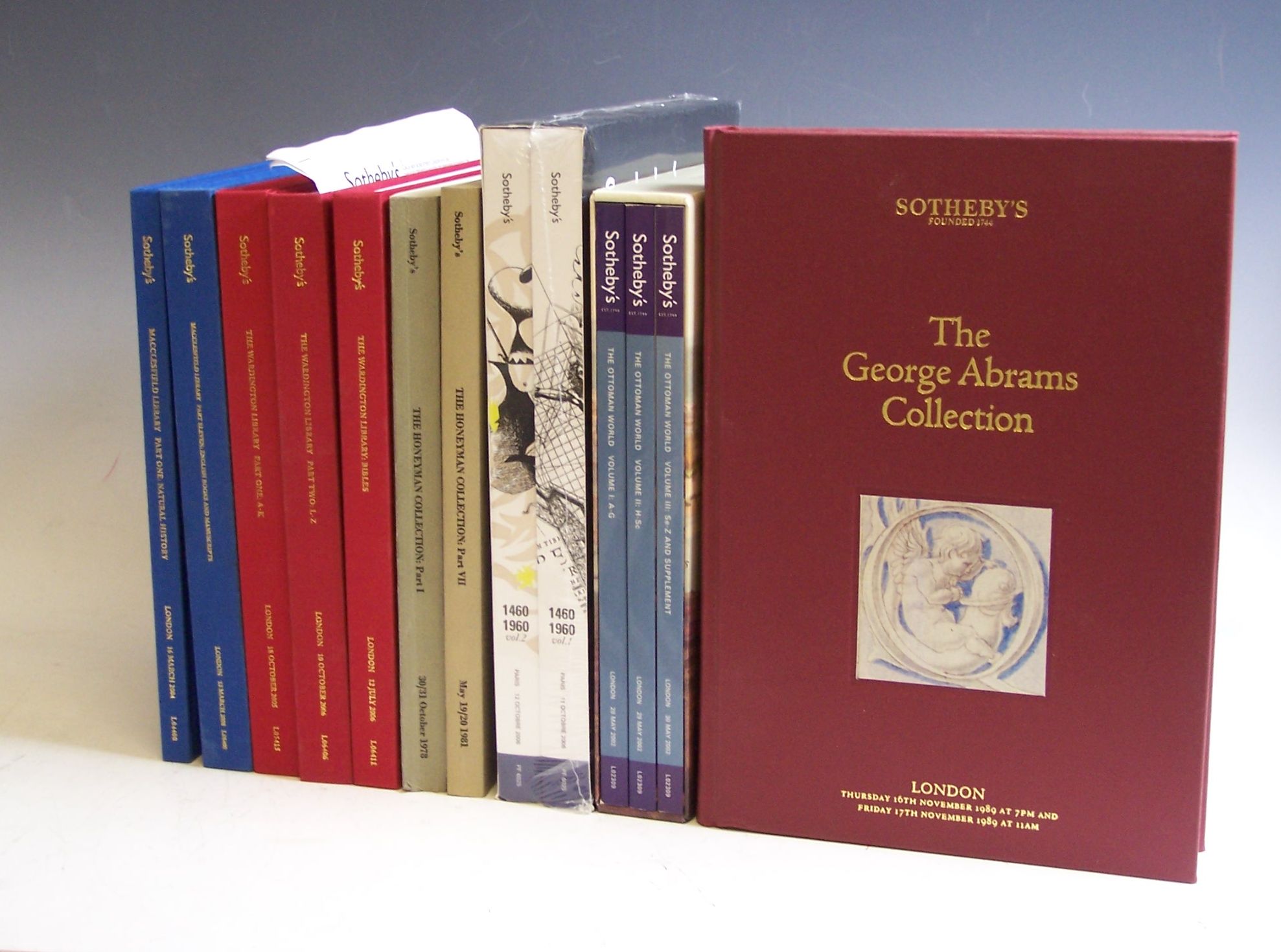 The Macclesfield library. London: Sothebys, 2004-08. 4to, 11 volumes, original blue cloth gilt; Wardington The Wardington library. London, 2005-06. 4to, 3 volumes, original red cloth gilt; Science The Honeyman collection of scientific books and manuscripts. London, 1978-81. 4to, 7 volumes, original wrappers; Abrams The George Abrams collection. London, 1989. 4to, original red cloth gilt; Atabey The Ottoman world: The library of Sefik E. Atabey. London, 2002. 4to, 3 volumes, original wrappers, slipcase; Feinsilber Collection Fred Feinsilber 1460 - 1960. Paris, 2006. 4to, 2 volumes, original wrappers, slipcase, unopened in original plastic film; and 67 other Sothebys book catalogues, all in fine condition (94)